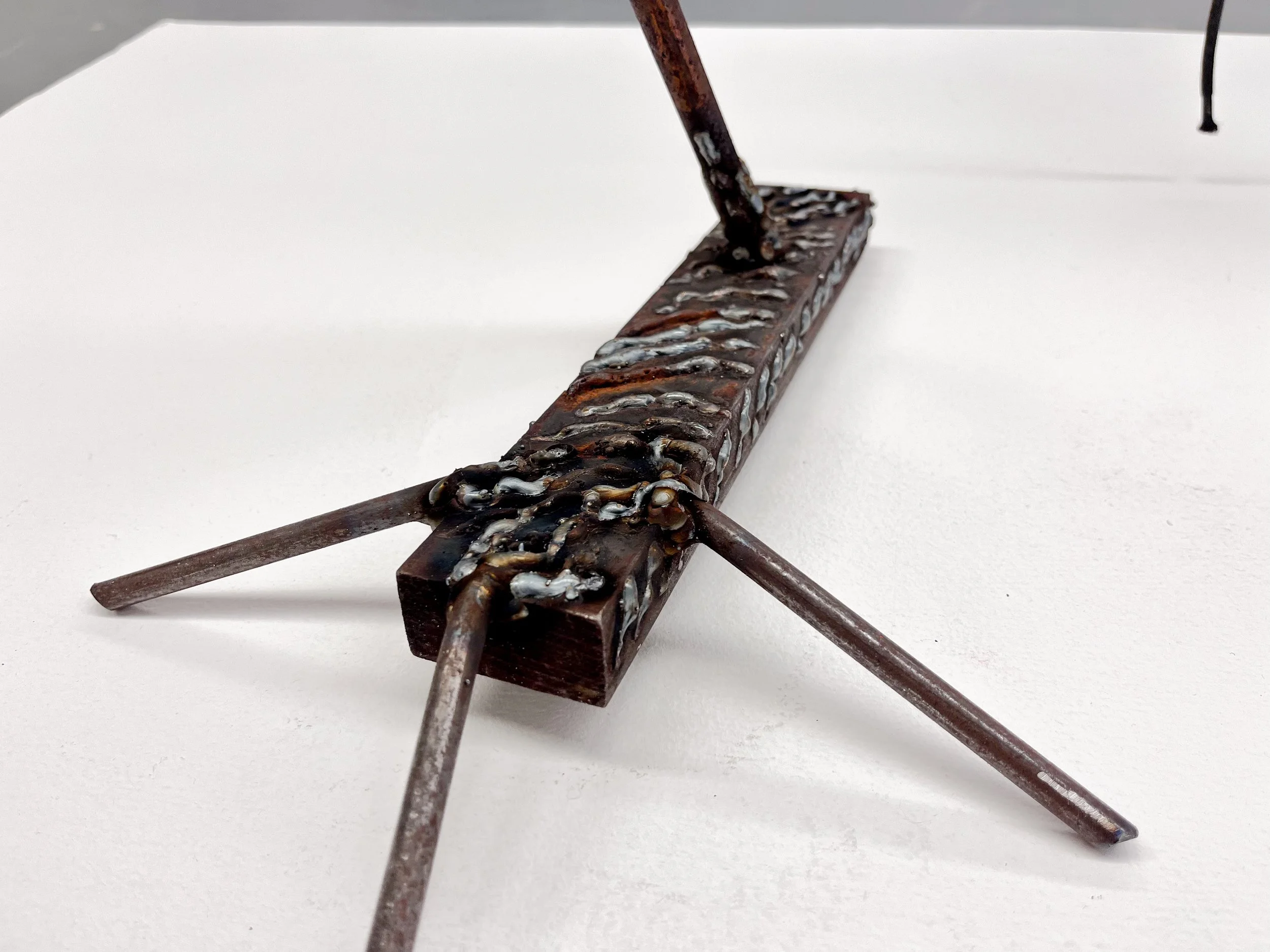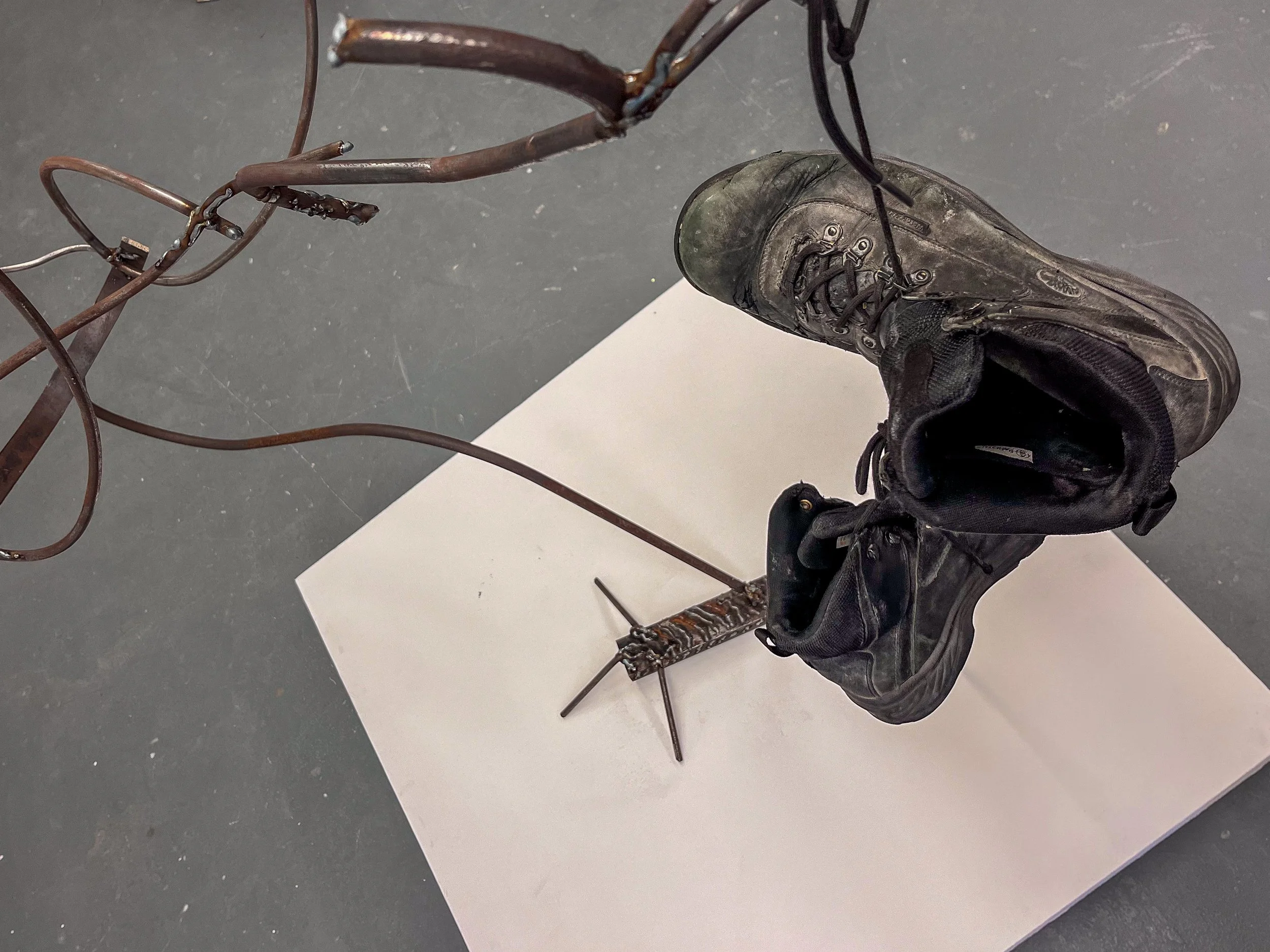 "Sweet Pea" emerged during my final undergraduate semester, as I was exploring the potential significance of ordinary, functional objects. While my thesis primarily deconstructed and destroyed the traditional notions surrounding a teapot, both physically and conceptually, this sculpture branched off from the same concept of investigating the potential importance of a mundane item. In this case, a worn pair of boots, although the creative process differed the idea stemmed from idolizing the boots while also accentuating their texture, shape, and inherent identity. The boots are precariously supported by a welded structure, emphasizing their weight and again emphasizing their significance. Without the boots, the structure will not stand, highlighting the piece's reliance on this seemingly insignificant object, elevating its status and prompting contemplation of the extraordinary within the ordinary.